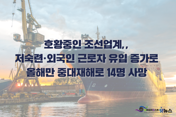 [세이프티퍼스트닷뉴스] 이번달 14일 기준으로 조선업에서 깔림, 화재·폭발, 추락 등 10건의 중대재해가 발생해 총 14명이 사망했다.