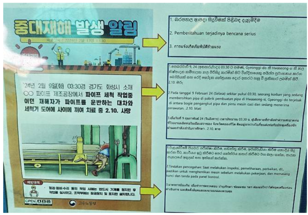한편, 일부 공장에서는 자신의 사업장에서 근무하고 있는 외국인 근로자들에게 위험을 고지하고, 안전사고를 예방하기 위해 고용노동부가 배포한 '중대재해 사이렌'의 내용을 작업자들이 사용하는 모국어로 번역해 게시하는 방식으로 안전관리에 힘쓰고 있는 것으로 알려졌다.