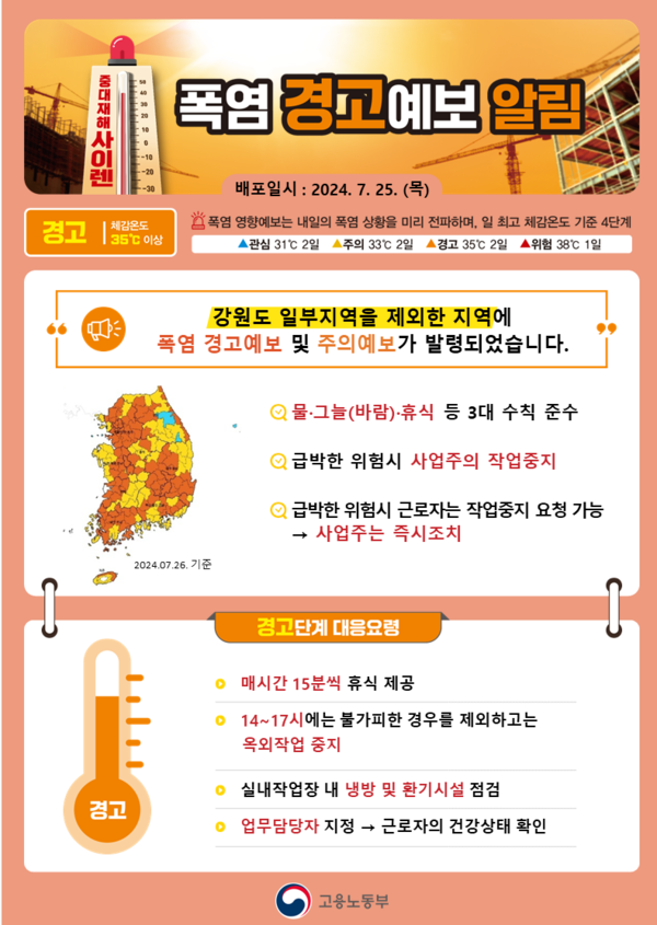- 폭염 주의·경고 발령! ,, 고용부,'폭염·집중호우·태풍' 취약 사업장 집중 점검 실시