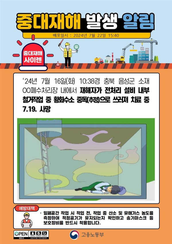 [세이프티퍼스트닷뉴스] 지난 7월 16일 충북 음성군소재 폐수처리장 내에서 전처리 설비의 내부 철거 작업을 하던 작업자가 황화수소 중독으로 쓰러져 치료를 받던 중 지난 19일 사망했다.