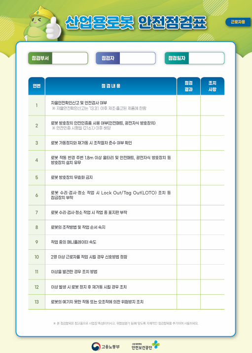 산업안전보건공단에서는 위의 3가지 조문이 모두 담긴 체크리스트를 배포하고 있다. 사업장에서는 아차사고, 위험성평가 등 사업장 특성에 맞도록 자체적인 점검항목을 추가하여 사용해서 안전활동을 할 수 있다.