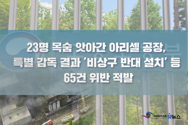 [세이프티퍼스트닷뉴스] 고용노동부가 지난 6월 24일 화재 사고로 23명의 사망자가 발생한 아리셀 전지(배터리) 제조 공장에 대해 산업안전보건법에 따라 지난 7월 3일부터 16일까지 2주간 산업안전보건 특별감독을 실시했다.