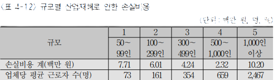산업재해의 경제적 손실비용 관련 연구]에 따르면 50인 이상 100인 미만의 기업의 경우 손실 비용의 비율을 살펴보면, 사고 손실 및 재발방지 비용이 47.3%로 가장 높으며, 다음이 보상 비용 39.2%으로 두 가지 항목이 거의 대부분을 차지한다고 한다.