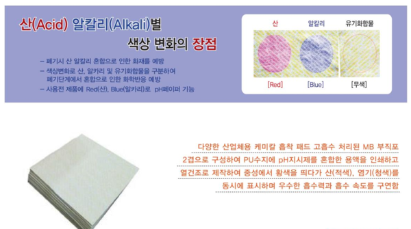 '환경재난대비 제품'으로 인정받아 조달청 혁신 제품으로 선정되기도 한 이 흡착 패드는 'pH 변화에 따른 색상 변화'를 통해 산성, 염기성, 유기용제를 즉각적으로 구분할 수 있어 현장에서 보다 빠르게 대응할 수 있다. 또한, 고흡수 처리된 MB 부직포를 사용하여 유해물질을 신속히 흡수하고 확산을 방지하는 데 탁월한 성능을 발휘한다는 평가를 받고 있다.