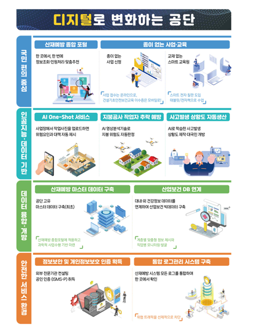 안전보건공단(이사장 안종주)은 디지털플랫폼정부 추진 전략을 바탕으로 4대 전략과 24개의 세부과제를 수립하고, 이를 올해부터 본격적으로 시행한다고 밝혔다. 공단의 4대 추진 전략은 ▲국민 편의 중심의 산재예방 허브 구축 ▲인공지능과 데이터 기반 사업 추진 ▲민관 협력을 통한 성장 ▲안전한 산재예방 서비스 환경 조성이다.