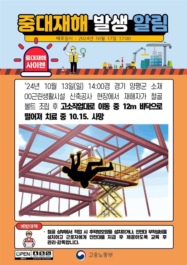 - 지난해 중대재해 원인 중 42%가 '떨어짐',, 고용부, 떨어짐 사고 다발 '경보’ 발령