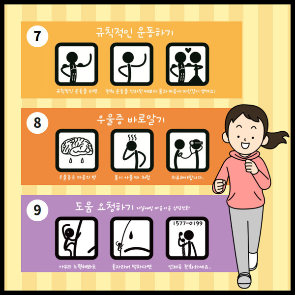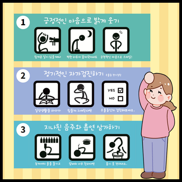 긍정적인 마음으로 밝게 웃거나 스트레스를 흡연이나 음주로 풀지 않아야 합니다. 다음에 소개되는 우울증 예방 TIP을 참고하여 혼자만 끙끙 앓지 마시고 방법을 찾아보세요~
