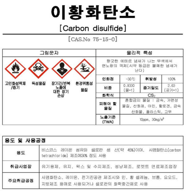 이황화탄소는 1796년 독일의 화학자 람패디우스(Lampadius)가 황철광과 숯을 혼합해 만든 물질로, 고무, 셀로판, 인견 등의 섬유 합성에 사용한다. 레이온 공장에서 가장 많이 사용하지만, 고무 공장에서도 많이 사용하며, 셀로판 공장이나 농약 공장에서도 많이 사용한다. 이황화탄소는 기름을 녹이는 성질이 있어 유기용제의 하나로 사용되고, 휘발성이 강해 호흡기를 통해 쉽게 신체로 유입된다. 강한 신경 독가스로, 2차 세계대전 당시 유대인 학살용으로 사용됐다.
