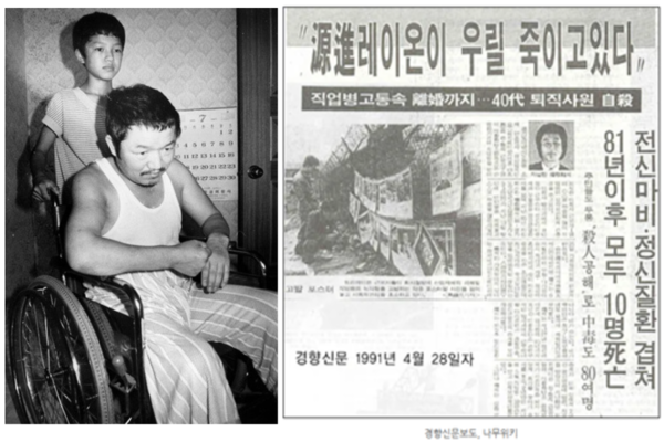 “인견사를 생산하는 원진레이온 공장에서 신경 독성 물질인 이황화탄소 중독 환자가 잇따라 발생, 말과 몸 움직임이 부자유스러운 중증 마비 상태에 이르러 회사로부터 강제 퇴직당한 사람이 1986년 이래 12명이나 되는 것으로 밝혀졌다. 중독은 주로 이황화탄소 용액으로 녹인 펄프에서 인조 견사를 뽑아내는 방사과에서 발생했는데, 퇴직자 중 서용선(46), 한병화(52) 씨 등은 팔다리가 완전히 마비되고 말을 못하며, 대소변도 못 가리는 심한 장애에 빠져 있으며, 정근복(49), 정명섭(46) 씨 등도 정상적인 사회 활동이 어려운 상태다.”