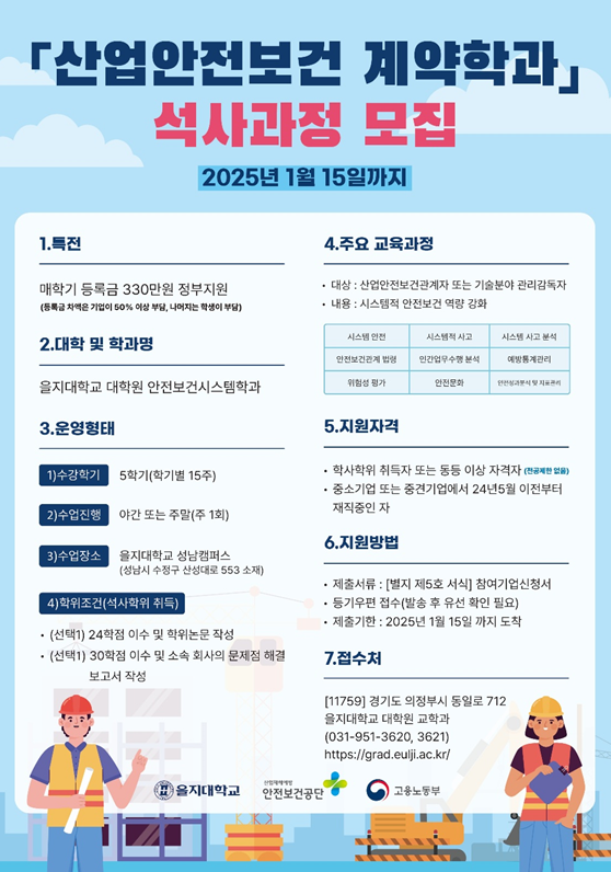 신설된 안전보건시스템학과는 2년 6개월간 5학기 과정으로 운영되며, 야간 또는 주말에 주 1회 을지대학교 성남캠퍼스에서 진행된다. 학위 취득 요건으로는 학위논문을 작성하거나, 소속 기업의 안전 문제를 해결하는 실무형 보고서를 제출해야 한다. 주요 교육 과정으로는 시스템 안전, 위험성 평가, 안전관리 법령, 사고 분석, 인적오류 분석 등 산업 현장에서 실질적으로 적용 가능한 내용이 포함돼 있다.