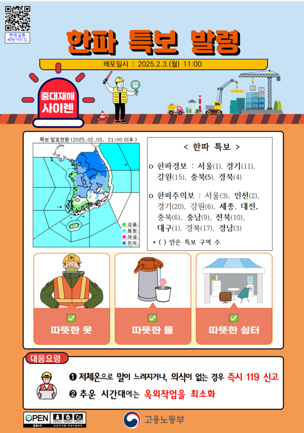 [세이프티퍼스트닷뉴스] 2월 초, 한파가 전국적으로 강타하며 서울은 체감온도가 영하 10도까지 떨어졌다. 기상청에 따르면 이번 주 내내 최저 기온이 영하 9도에 머물 것으로 예상되며, 일부 지역에는 폭설 가능성도 제기됐다. 동절기에는 낮은 기온과 불안정한 날씨로 인해 산업현장에서 화재, 낙상, 질식 등의 사고가 발생할 위험이 커지며, 철저한 안전 대책 마련이 요구된다.