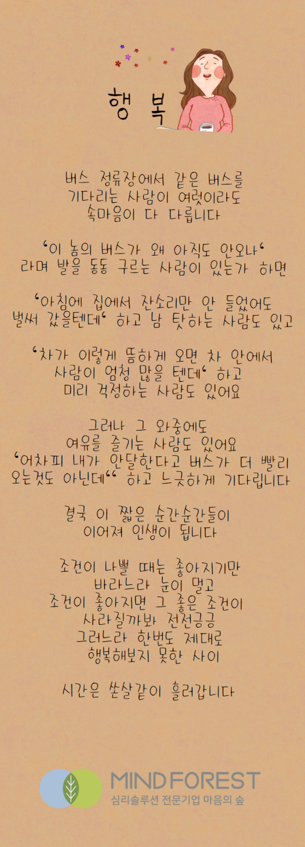 지금 이 순간도 여러분이 느끼지 못하는 행복이 나에게 가까이 다가와 있습니다. 미래를 생각하는 것도 좋지만, 미래를 위해서 현재의 행복을 버린다면.. 시간은 쏜살같이 흘러가 버리고 맙니다..