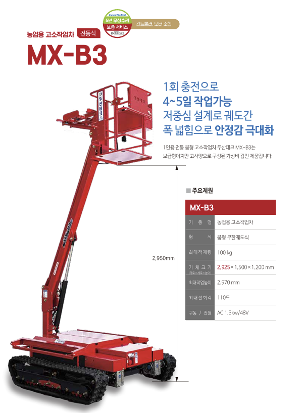 두산테크의 최신 고소작업차인 MX-B3 모델은 작업자의 안전을 고려한 첨단 설계로 주목받고 있다. 이 모델은 전기식 조이스틱 레버를 통해 조작이 용이하며, 남녀노소 누구나 사용할 수 있도록 설계되었다. 자체 진동과 흔들림이 거의 없어 안정적인 작업 환경을 제공한다.