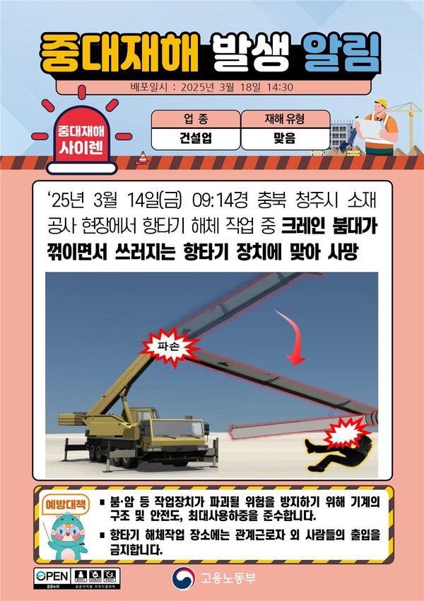[세이프티퍼스트닷뉴스] 지난달 14일 오전 9시 10분경, 충북 청주시 흥덕구 송절동 청주테크노폴리스 아파트 신축 현장에서 항타기 해체 작업 중 이동식 크레인의 붐대가 꺾이며 항타기 전체가 전도되는 사고가 발생했다. 이 사고로 50대 근로자 A씨가 항타기 구조물에 치여 현장에서 사망했다.