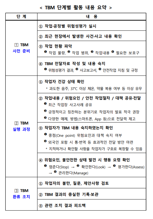 사고를 예방하기 위해서는 TBM을 단순한 보고 절차가 아닌, 실제 위험요소를 선제적으로 점검하고 대응조치를 협의하는 실천적 절차로 운영하는 것이 필수적이다.