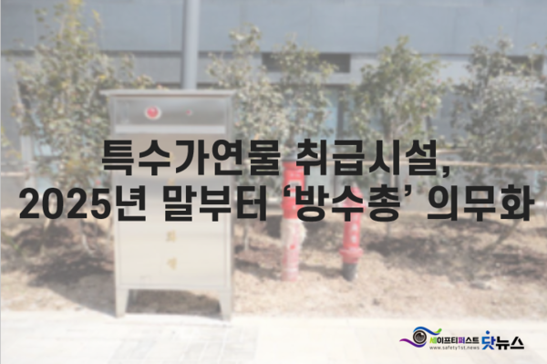 - 지정수량 750배 이상 취급시설, 옥외소화전과 연계해 방수총 설치 의무화,, 2025년 말부터 본격 시행
