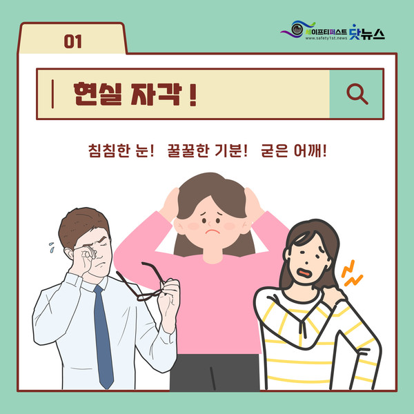 장시간 컴퓨터 앞에 앉아 근무하는 사무직 근로자에게는 눈의 피로뿐 아니라, 어깨·목·손목 등 다양한 근골격계 통증이 발생할 수 있다. 이러한 통증을 예방하기 위해서는 하루 2~3회, 짧은 시간이라도 스트레칭을 실시하는 것이 도움이 된다.