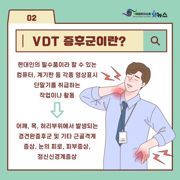VDT증후군이란 무엇일까? 현대인의 필수품이라 할 수 있는 컴퓨터, 계기판 등 각종 영상표시단말기를 취급하는 작업이나 활동으로 인하여 어깨, 목, 허리부위에서 발생되는 경견완증후군 및 기타 근골격계증상, 눈의 피로, 피부증상, 정신신경계증상을 말한다.