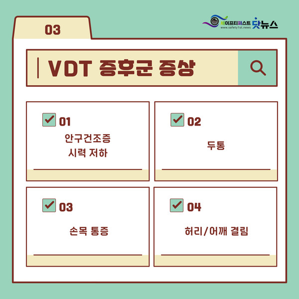 대표적인 VDT증후군 증상으로는 안구건조증, 시력저하, 두통, 손목통증, 허리/어깨 결림 등이 나타난다. 최근에는 재택근무 확산과 모바일 기기 사용 증가로 인해 VDT 증후군 유병률이 높아지는 추세다.
