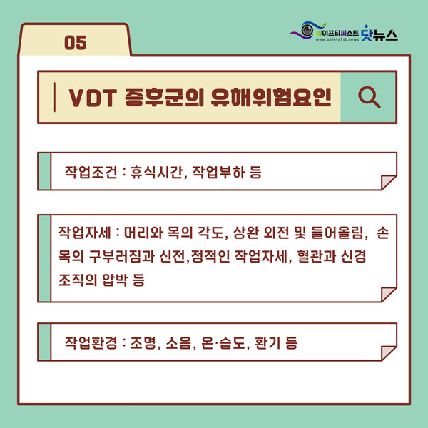 VDT 증후군의 유해위험요인으로는 ▲작업조건(휴식시간, 작업부하 등), ▲작업자세(머리와 목의 각도, 상완 외전 및 들어올림, 손목의 구부러짐과 신전, 정적인 작업자세, 혈관과 신경조직의 압박 등), ▲작업환경( 조명, 소음, 온·습도, 환기) 등 이 있다.