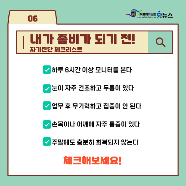 하루 6시간 이상 컴퓨터를 사용하는 경우, 또는 업무 중 눈의 피로, 두통, 손목·어깨·목 부위의 통증이 지속된다면 VDT(Visual Display Terminal) 증후군이나 직무 스트레스 위험군일 수 있다. 집중력이 떨어지거나 업무 후 무기력이 느껴지고, 주말 동안 충분한 휴식을 취했음에도 피로가 해소되지 않는다면 특히 주의가 필요하다. 이 같은 증상이 반복된다면 전문가의 상담을 받아보는 것이 좋다.