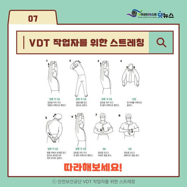 위 그림에는 안전보건공단이 제시한 ‘VDT 작업자를한 스트레칭’ 8가지 동작이 소개되어 있다. 각 동작은 5~10초 정도 유지하며 천천히 반복하는 것이 효과적이며, 작업 도중 틈틈이 시행하는 것이 바람직하다.