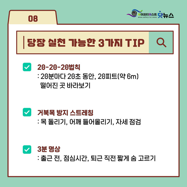 작은 습관의 변화만으로도 업무 중 발생할 수 있는 신체적·정신적 부담을 줄일 수 있다. 대표적인 실천 방안으로는 '20-20-20 법칙'이 있는데, 이는 20분마다 20초간 약 6m 거리의 사물을 바라보며 눈의 피로를 줄이는 방법이다. 또한 업무 중간에 목과 어깨를 스트레칭해 자세를 바로잡고 근육을 이완하는 것도 도움이 된다. 짧은 명상이나 심호흡을 통해 정신적 긴장을 완화하는 습관도 일상에서 실천할 수 있는 유익한 방법이다.