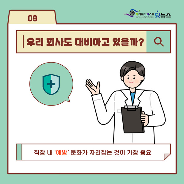 이러한 위험 요소를 사전에 인지하고, 근로자 개인의 일상적인 건강 관리 노력뿐 아니라, 기업과 조직 차원에서의 예방 중심 문화 정착이 함께 이루어져야 한다. 이는 일회성 교육이나 캠페인에 그치지 않고, 조직 전반에 안전보건을 내재화하는 체계적인 접근이 필요하다.
