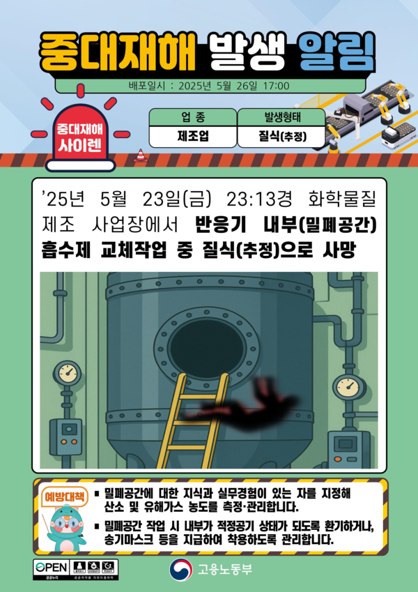 [세이프티퍼스트닷뉴스] 2025년 5월 13일(금) 23시 13분경, 한 화학물질 제조 사업장에서 반응기 내부(밀폐공간) 흡수제 교체 작업 중 작업자가 질식으로 사망하는 사고가 발생했다.