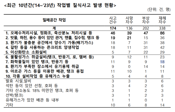 밀폐공간에서 발생하는 질식사고는 치명률이 높은 재해 유형으로, 최근 10년간(2014년~2023년) 총 174건이 발생해 338명의 산업재해자가 발생했으며, 이 중 136명이 사망했다. 이는 같은 기간 다른 사고성 재해의 사망률(0.98%)보다 약 41배 높은 수치다.