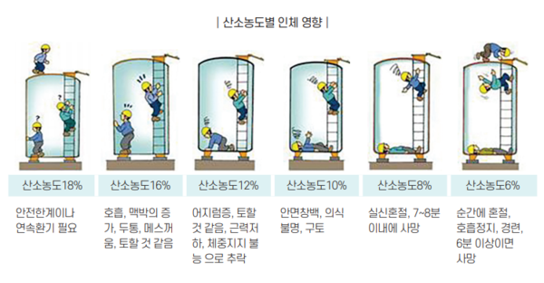 이러한 환경에서 신체에 필요한 산소가 충분히 공급되지 않으면 질식사고로 이어질 수 있다. 산소농도가 낮은 공간(18% 미만)에서는 물론, 정상 범위(18~23.5%) 내에 있더라도 일산화탄소처럼 혈액 내 산소 운반을 방해하는 가스가 존재할 경우에도 질식 위험은 발생할 수 있다.