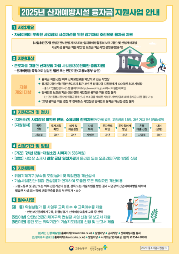 이처럼 회전체 사고를 비롯한 안전 재해 예방을 위해서는 방호 설비의 설치와 사업장 설비의 개선 및 교체가 필수적이다. 고용노동부는 위험 설비 교체 및 작업 환경 개선이 필요하지만 자금여력이 부족한 사업장들을 위해 '2025년 산재예방시설 융자금 지원사업'을 운영하고 있다. 산재보험에 가입한 300인 미만 사업장을 대상으로, 위험기계기구 교체나 방호장치 설치, 유해요인 개선 설비 등에 대해 장기 저리로 자금을 지원한다. 특히 회전체 사고처럼 기계적 위험이 높은 분야에서는 기술진단과 연계된 컨설팅도 제공되어, 실질적인 안전 확보를 위한 기반으로 활용 가능하다.