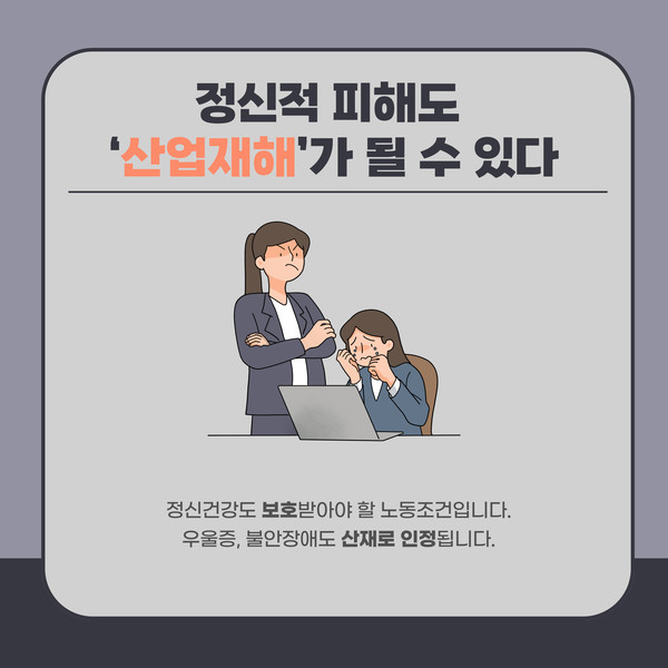 정신건강도 보호받아야 할 노동조건이다. 우울증, 불안장애도 산재로 인정된다. 직장 내 괴롭힘으로 인한 우울증, 불안장애, 공황장애 등 정신질환은 근로복지공단을 통해 산업재해로 인정받을 수 있다. 산재 신청이 승인되면 치료비, 휴업급여, 심리상담 등 다양한 지원을 받을 수 있다.