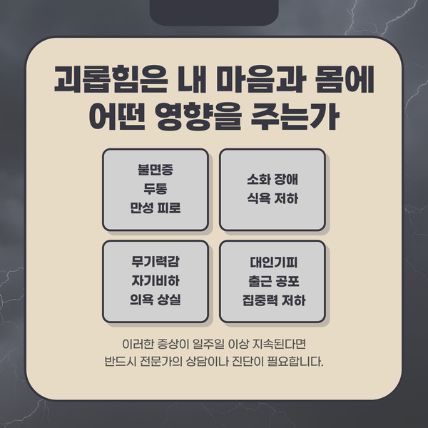 지속적인 괴롭힘은 심리적 스트레스를 넘어서, 신체적 이상으로도 나타난다. 대표적인 증상으로 ▲불면증, 두통, 만성 피로 ▲소화 장애, 식욕 저하 ▲무기력감, 자기비하, 의욕 상실 ▲대인기피, 출근 공포, 집중력 저하 등이 있다. 이러한 증상이 일주일 이상 지속된다면 반드시 전문가의 상담이나 진단이 필요하다.