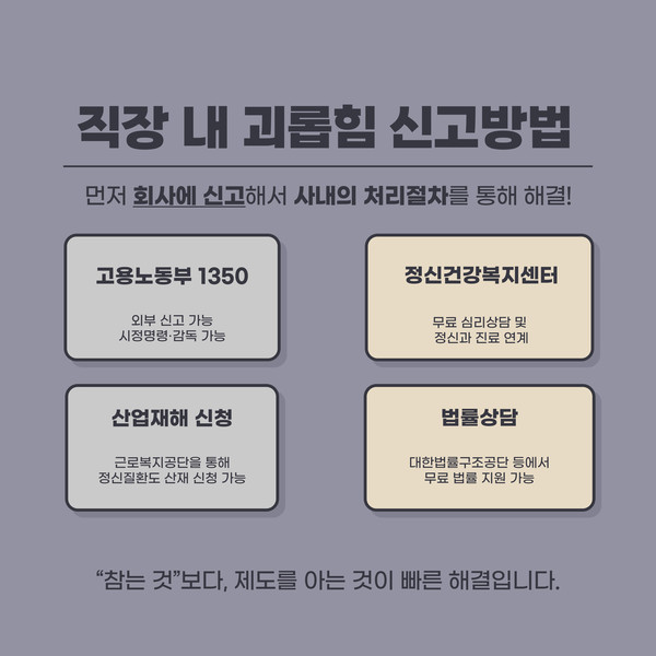 그렇다면 어떻게 대응할 수 있을까? 참는 것 보다, 제도를 아는 것이 빠른 해결이다. 직장 내 괴롭힘이 발생했을 때 사용할 수 있는 제도는 ▲사내 신고 ▲고용노동부 1350 ▲정신건강복지센터 ▲산업재해 신청 ▲법률상담 등으로. 피해자가 침묵하지 않아도 되도록 법과 제도가 존재한다.