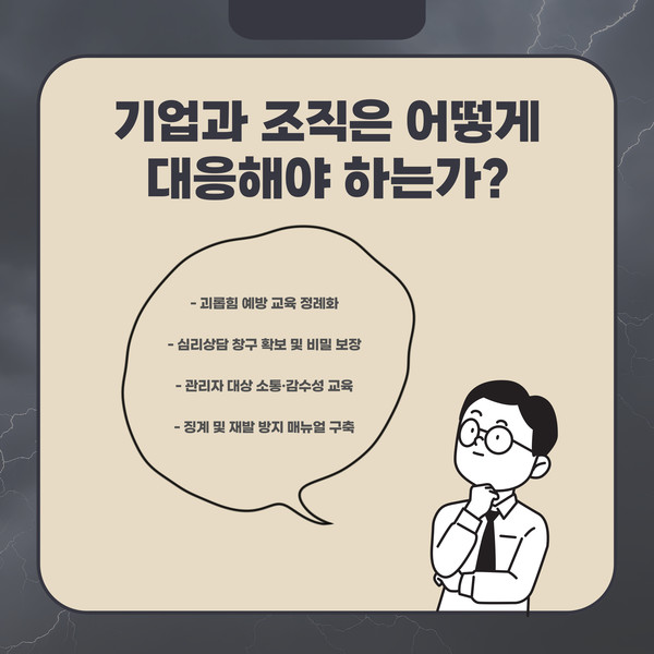 조직은 더 이상 괴롭힘을 '개인의 민감성' 문제로 치부해서는 안된다. 기업과 기관이 해야 할 일은 ▲괴롭힘 예방 교육 정례화 ▲심리상담 창구 확보 및 비밀 보장 ▲관리자 대상 소통·감수성 교육 ▲징계 및 재발 방지 매뉴얼 구축 등으로 직원 보호를 넘어, 기업의 법적 책임과 평판 리스크 관리를 위한 필수 요소이다. 직원의 정신건강은 조직의 지속가능성과 직결된다는 것을 잊지 말아야 한다.