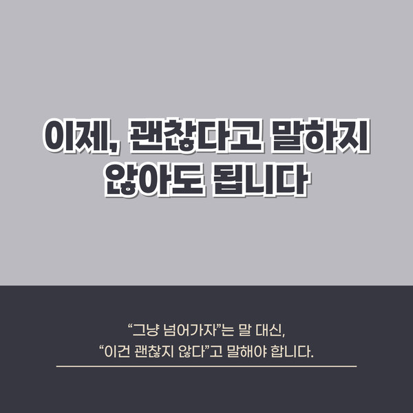 ‘그 정도는 다 겪는 일’이라는 말은 더 이상 괴롭힘을 정당화하는 도구가 되어서는 안된다. 직장 내 괴롭힘은 정신적 산업재해이며, 대응할 수 있는 권리와 제도가 마련되어 있다. 지금이 바로, 당신의 마음을 지키기 위한 첫 걸음을 시작할 때이다.