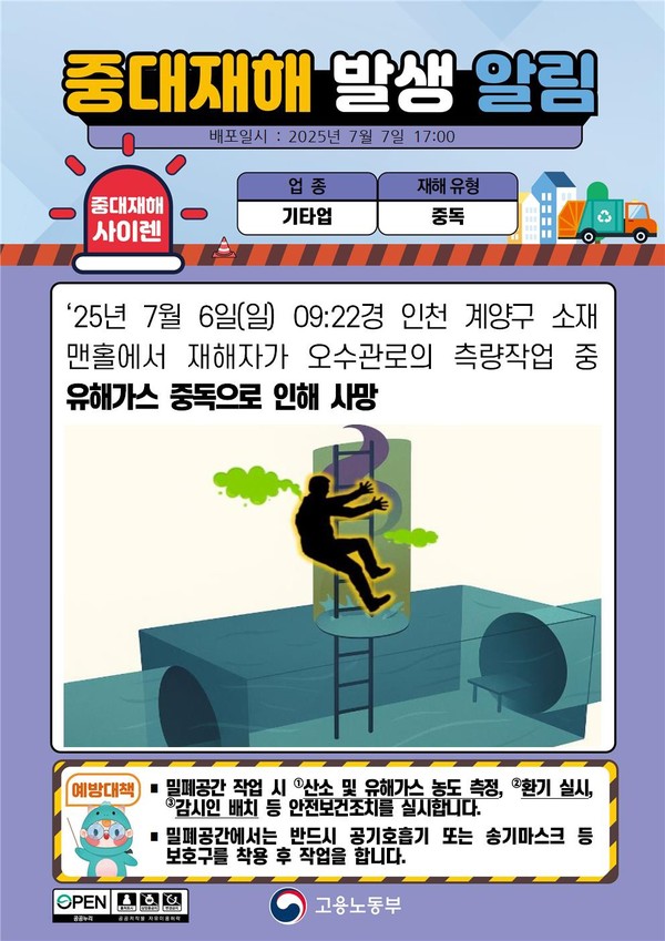 [세이프티퍼스트닷뉴스] 지난 7월 6일 오전, 인천시 계양구의 한 맨홀에서 측량 작업을 수행 중이던 근로자 한 명이 의식을 잃고 쓰러진 채 발견됐다. 구조 이후 병원으로 옮겨졌으나 안타깝게도 숨졌다. 사인은 유해가스에 의한 질식으로 알려졌다.