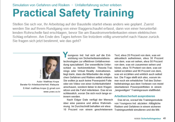 이 기사는 독일잡지 「 Sicherheitsingenieur (보안엔지니어) 10/2020」 홈페이지https://www.direktabo.de/de/sicherheitsingenieur-ausgabe-10-2020.html 에 올해 10월호에 개재되었던 '영우산업(주)의 안전체험관' 에 관해 소개된 기사내용으로, 관련 내용을 함께 소개하고자 한다. 저자는 Mr. Matthias Krope 로 노동 안전 전문가이다.
