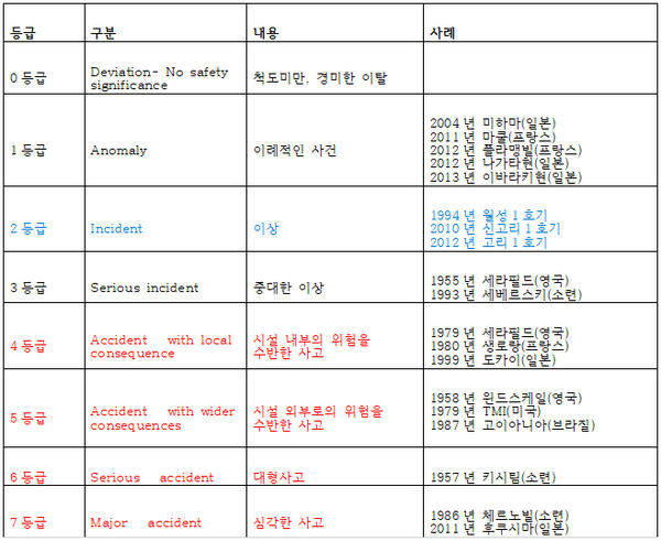 이 말이 틀린 것은 아니지만 안전의 기준을 어디로 잡느냐에 따라 틀릴 수도 있다. 국제 원자력 기구(IAEA)가 정한 원자력 사고 고장등급(INES ,International Nuclear Event Scale)에 의하면 원자력 발전소의 사고등급은 7단계로 구성되는데 1~3등급을 고장이(incident)라 하고, 4~7등급을 사고(accident)라고 한다. 또한 안전에 중요하지 않은 사건에 대해서는 등급이하(0등급; Below Scale)라 하여 경미한 이탈(Deviation)로 분류하고 있으며, 안전과 무관한 사건은 등급외 사건(Out of Scale)으로 규정하고 있다.