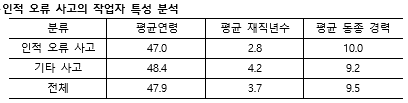 - 인적 오류 사고에 의한 사고 발생(117건) 비율: 미착용(34.2%), 오조작(17.1%), 무리(15.4%), 착각(8.5%), 부주의(6.8%), 실수(5.1%), 위반(2.6%)