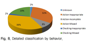 행위에 따른 휴먼 에러를 살펴보면 행동 중에서도 행동의 불이행과 부적절한 행동이 각각 36%와 32%를 차지해 가장 큰 문제로 나타났다(Fig. 8).