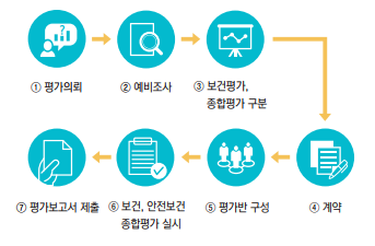 평가추진 절차는 먼저 평가의뢰를 한후 예비조사를 시행한다. 그후 보건평가와 종합평가로 구분한 후 평가의뢰기관과 계약이 성립되면 평가반을 구성하여 평가를 실시하고, 마지막으로 평가보고서를 제출하는 순서로 진행된다.